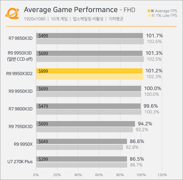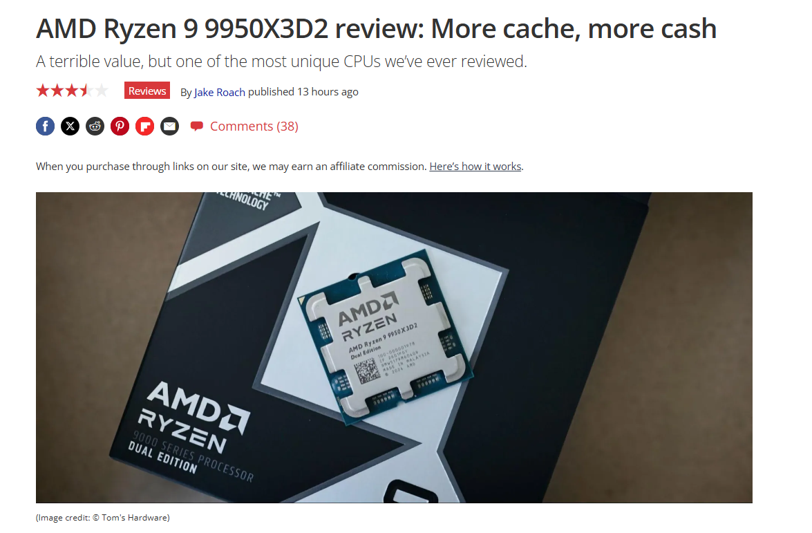 Tom's Hardware的评测更标题直接用“更多缓存,更多票子”定调,直言它在游戏里对比9950X3D没有任何优势,甚至锐龙79800X3D和9850X3D的帧率还要略高一点。