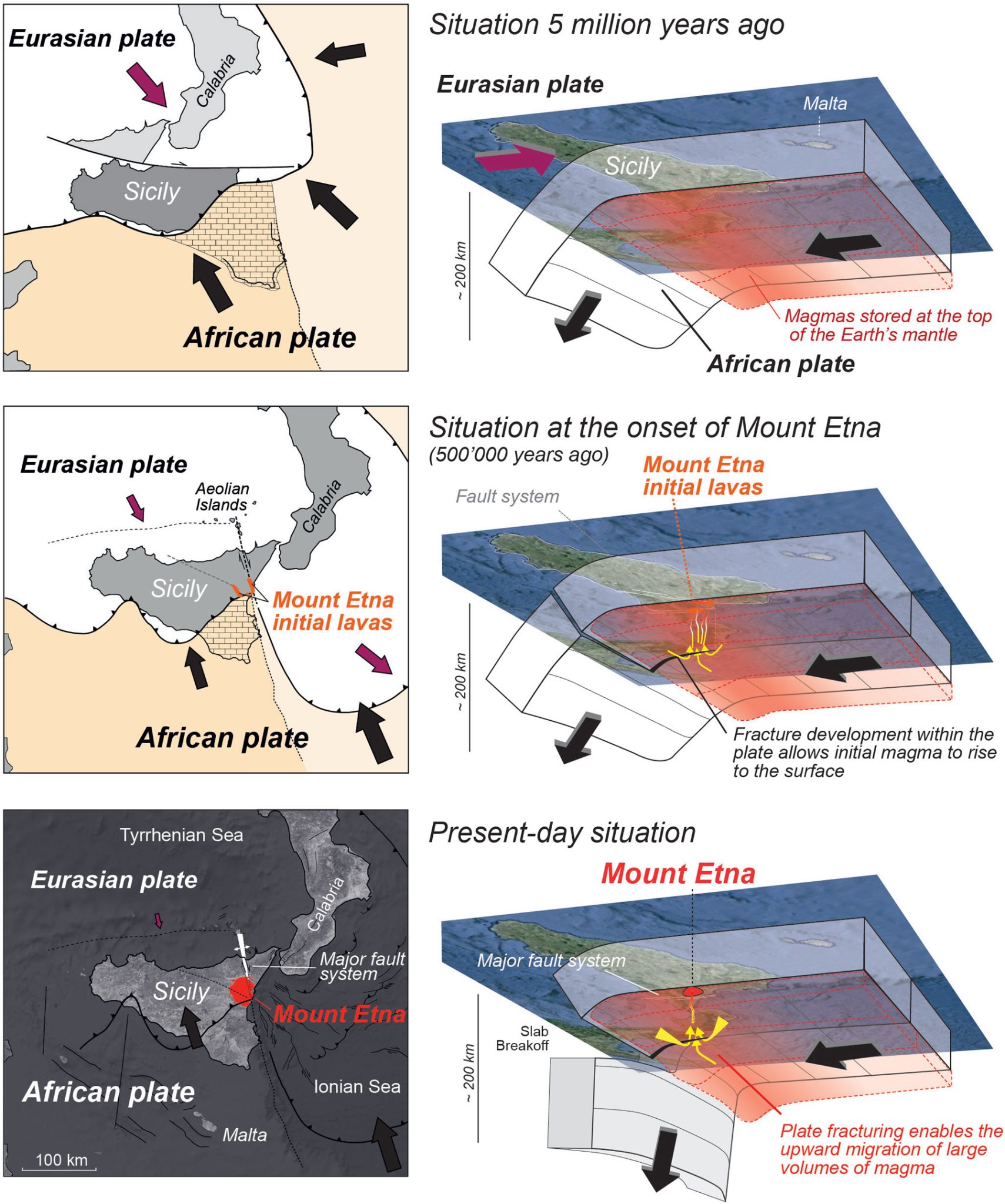 洛桑大学研究团队与意大利国家地球物理与火山学研究所(INGV)卡塔尼亚分部的安娜·罗萨·科尔萨罗合作,在《地球物理研究杂志:固体地球》上发表论文,提出埃特纳火山的岩浆并非在临喷发前才在地幔中大规模熔融生成,而是长期由上地幔中预先存在的少量岩浆“库存”不断补给。这些岩浆聚集在距离地表约80公里的上地幔顶部,随后在构造应力的驱动下间歇性上涌。