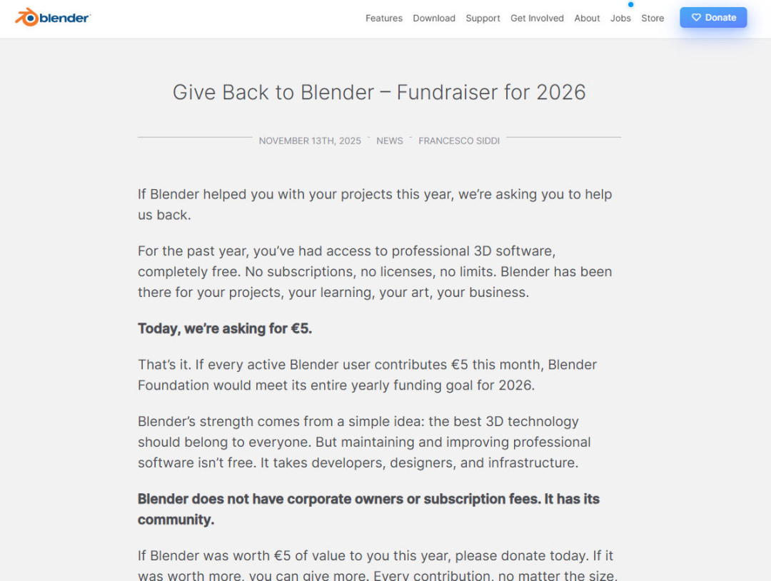 按理说,这样的用户量应该不缺钱,但由于是开源工具,Blender几乎每年都要在官网上演一出苦情戏:请求捐赠,解释资金紧张,呼吁大家掏钱。比如2024年,Blender发起了2%捐赠活动(只要有2%用户捐赠即可保持30人团队运营),2025年发起了5欧元捐赠活动(每用户5欧元足够公司活过2026年)。