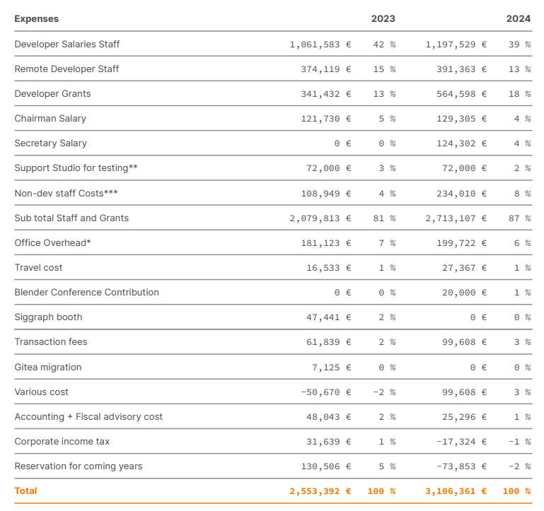 从年报来看,Blender将55%的支出用在了人员身上:全职团队、远程开发者、测试人员、办公室租金、会议、税费。这笔账算下来,董事长Ton的年薪是12.9万欧元,在欧美资深开发者里算是中等收入,可以说丝毫没有浪费。虽然收入比2023年增长了20%,但它依然亏损。