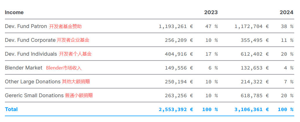 2024年,Blender所获收入为310.6万欧元。这个数字对小团队可能不算少,但对于一个30多人的团队而言,显然杯水车薪,与对手Autodesk对比,不足后者年收入的千分之一。