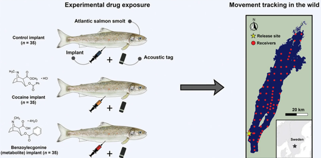 这项研究追踪了韦特恩湖中那些接触过可卡因、及其代谢物的大西洋鲑鱼幼鱼的活动轨迹,研究的结果显示,这些“可卡因鲑鱼”的活动与正常鲑鱼明显不同。
