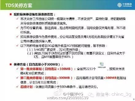 如果真有真的3G用户,如果真的还有4亿3G用户,我想移动真的关不了基站,用户还在网上,在没有迁移前是不敢关闭的;有人说,泄露出来的或许是个很小的省,或许是那个省没有4G用户了,但是移动的朋友告诉我是个大省;想想小灵通退网花了多少时间去做工作的?