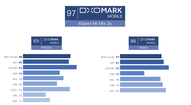 小米 Mi MIX 2S 在DxOMark的测试中拿下了97分,与苹果、谷歌和三星等更知名的制造商的高端手机的表现旗鼓相当。小米在照片类别中拿下了优异的成绩(101分),其静态摄影表现与 iPhone X 并列第二,仅落后于三星 S9 Plus 3分而已。其杰出的功能包括非常出色的相位检测自动对焦系统,其对焦表现非常快速、正确且可重复,并且在纹理保留和降噪之间取得了不错的平衡。在低光下,Mi MIX 2S 拍出了我们看到过最平滑的图像之一,户外图像中的亮度噪点也得到了很好的控制。