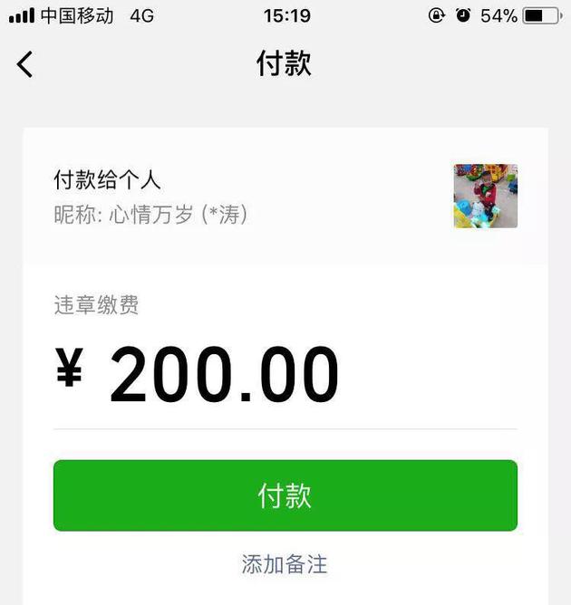 小编也是好奇,拿起手机对着二维码扫一扫,发现是一个微信付款界面,付款名称是违章缴费,金额设定好为200元,收款人名叫“心情万岁”。下方还有个付款按钮,只要点击确认输入密码即可完成付款。▼