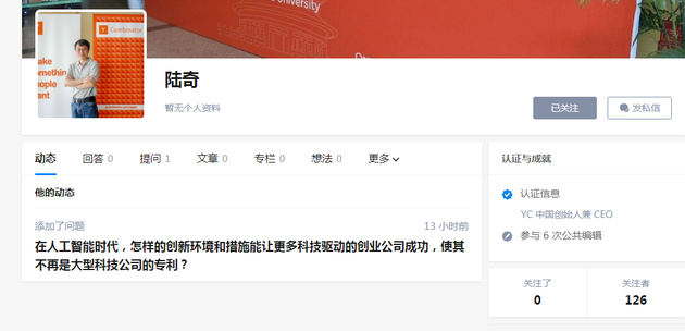 这是知乎“互联网洞见者”线上活动的一部分。根据问题编辑日志,陆奇是在29日晚21点提出问题,这也是目前他在知乎的唯一动态。