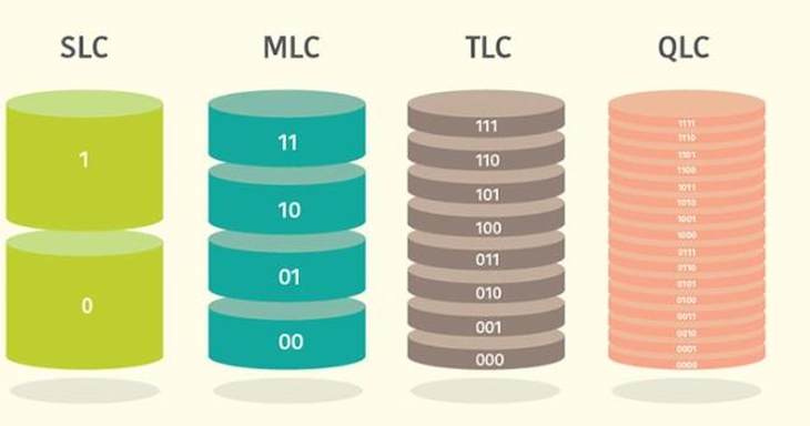 NAND闪存的基础单元被称作Cell,如果每个Cell只存储一个bit的数据也就是传统的SLC(Single-Level Cell )颗粒,如果存储2bit数据则称为MLC(Multi-Level Cell)颗粒,以此类推,TLC(Trinary-Level Cell)则为3bit,而QLC每个Cell中的数据达到了4bit。随着bit数量的增加,带来的好处是同样规模的颗粒可以存储更多的数据,从而实现SSD容量上的大规模提升。而这样带来的副作用是更繁琐的寻址带来的快速老化和同容量下更低的性能。