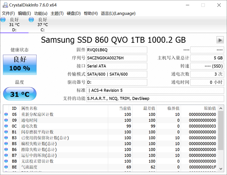 可以看到,支持了S.M.A.R.T,NCQ以及TRIM功能,DevSleep也没有缺席。