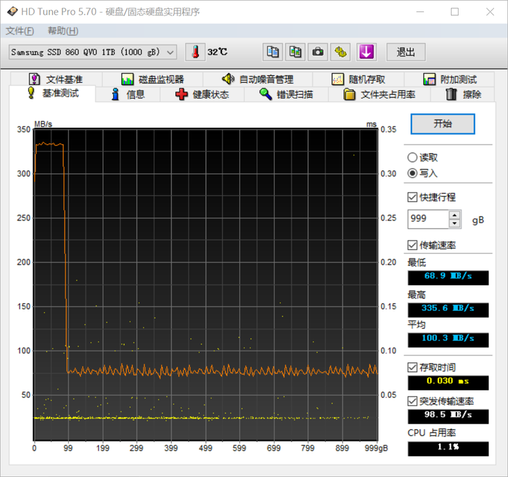 首先我们进行全盘写入,可以看到在80GB左右出现了大幅度的写入性能衰减,这意味着已经超出了模拟缓存的范围,在写满SLC缓存之后,三星860QVO的写入性能降低到了在75MB/s左右。