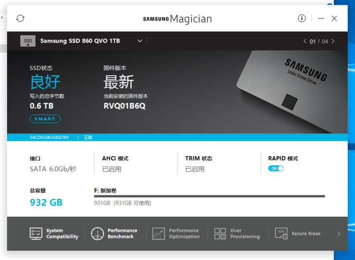 三星的Magician工具还提供了RAPID模式的选项,将一部分内存用作SSD缓存使用,从而实现大幅度的性能提升。