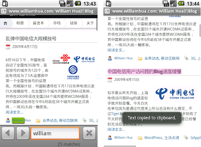 Android 1.5内置的Chrome lite浏览器采用了最新的Webkit引擎和Squirrelfish Javascript引擎,并且开始支持网页内容复制和页内搜索功能,窗口下方的Zoom In/Out 菜单也有变化,同时用户可以指定网页默认编码。我比较感兴趣的就是网页内容复制和页内搜索了,看一下截图吧。