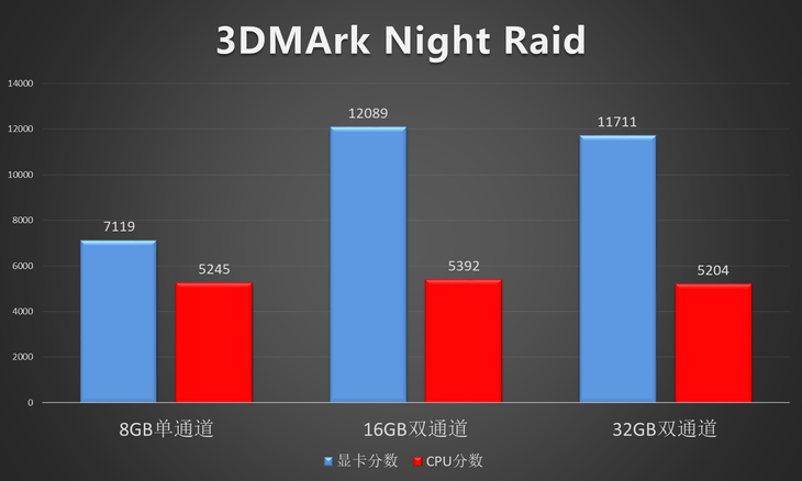APU最大特点在于融聚了CPU与GPU功能的产品,而被用户所看到的也正是其不俗的GPU性能。在3DMark基准测试软件中,就有一款专门针对低配产品推出的显卡性能测试软件——Night Raid。Night Raid主要针对的是配置较低的Windows设备,其中很有可能就包含ARM芯片的Windows设备。其测试内容包含动态反射、环境光遮挡、延迟渲染、曲面细分、景深效果和复杂粒子等测试,测试内容相对较为全面。通过测试我们发现,更换不同容量的内存对于CPU的性能并没有太大的变化,但在显卡性能方面,双通道16GB内存较单通道8GB内存有着近一倍的分数提升。