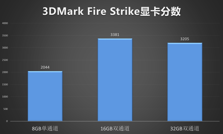 3DMark Fire Strike是一款专门针对1080p分辨率下的显卡基准测试软件,考虑到AMD 锐龙5 2400G本身的显卡性能只能处于中端水平,因此,我们将基准测试定位于3DMark Fire Strike,经过实际测试,可以看到,搭载单通道8GB内存的APU平台在测试中,分数仅为2044分,而双通道16GB以及双通道32GB的显卡分数均在3200-3300之间,因为单双通道内存的原因,二者相差分数达到1000以上,可见真正影响APU平台性能主要原因正是源自于此。