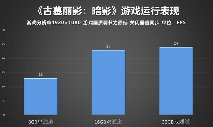 《古墓丽影:暗影》《古墓丽影:暗影》是2018年推出的一款3A级游戏大作,就测试而言,这款游戏不应为此次测试的主要项目,但为了保证与之前测试的一致性,我们再APU平台上同样对其进行了性能测试。但在画质方面,由于在最高画质下单通道8GB内存容量的平台无法满足《古墓丽影:暗影》的基本运行需求,因此,我们将画质统一调节为最低,分别测试三种不同内存容量下的游戏性能,最终结果显示,单通道8GB内容的APU平台仅能取得13帧的平均成绩,游戏卡顿明显,无法正常游戏,虽然更换双通道内存后有10帧以上的提升,但仍无法流畅运行游戏。