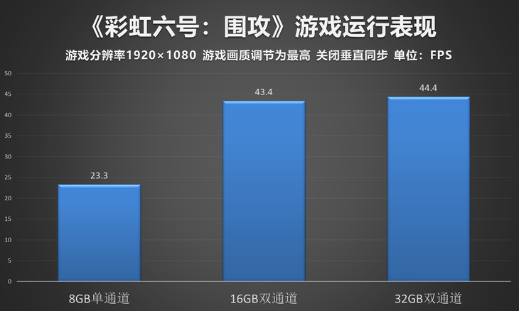 《彩虹六号:围攻》是我们本次测试的第二款游戏,经过测试,单通道8GB内存的APU平台仅取得23.3的平均帧数,卡顿明显,但在我们将内存升级为双通道后,不管是16GB还是32GB,在最高画质下均能够取得40以上的平均帧数,虽然游戏画面依旧有所卡顿,但对于普通玩家而言,已经属于基本可以实现流畅运行的目的。