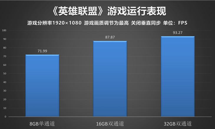 很多人都说《英雄联盟》虽然对于显卡的需求并不明显,但不同的内存对于这款游戏表现也不尽相同,因此,我们对这款游戏同样进行了测试,作为一款热门的网络电竞游戏,《英雄昂联盟》在实际测试中均表现出了高于60的平均帧数,但细心的用户会发现,虽然游戏可以流畅运行,但虽然内存容量的变化,游戏帧数同样有着非常明显的提升,此外,单通道在这款游戏面前同样表现出了性能孱弱的一面。