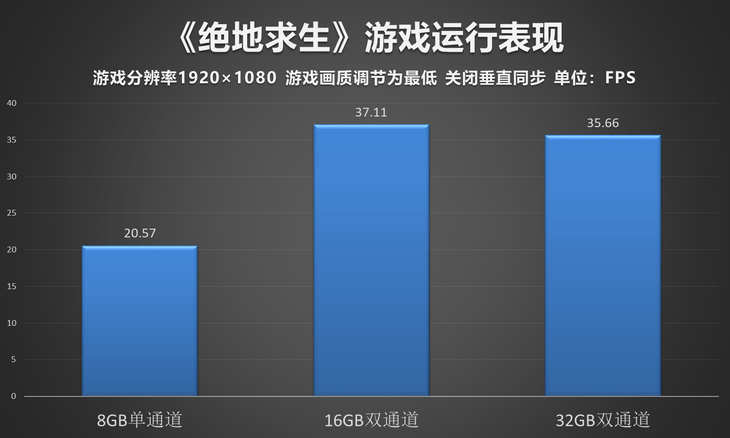《绝地求生》在2017年-2018年的火爆程度相信并不需要我们过多的阐述,因此我们对这款游戏同样进行的相关测试,最终测试结果显示,在最高画质下,三者的游戏体验均较为差劲,其中尤其是搭载单通道8GB内存的APU平台仅取得20.57的平均帧数,而更换为双通道游戏帧数有了明显的提升。
