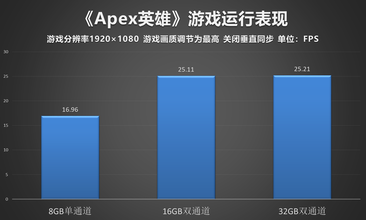 《Apex英雄》同样是一款最精彩火爆起来的第一人生射击类游戏,在之前的文章中,我们已经详细的介绍了这款游戏的亮点以及优势,在本次的测试中,我们也对该游戏在不同内存容量下的性能进行了测试,我们发现,游戏平均帧数表现同样不乐观,其中单通道下的APU平台表现出了与上述其他测试成绩相同的性能劣势。