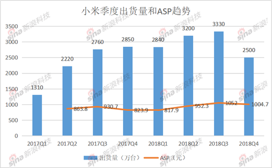 就2018年第四季度而言,小米的智能手机业务营收和出货量均出现环比下滑。其中该季度出货量甚至创下六个季度以来新低,仅有2500万台。