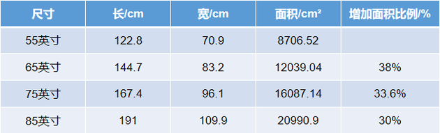 看到这里,很多人有疑问,为什么75英寸、85英寸的屏幕面积增加得越来越小,但是价格却比65英寸的电视上涨得更猛。