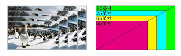 将55英寸到85英寸电视的大小尺寸对比一下,会发现从下面的效果图看,这10英寸的增加似乎并不明显,特别是从55英寸到65英寸。