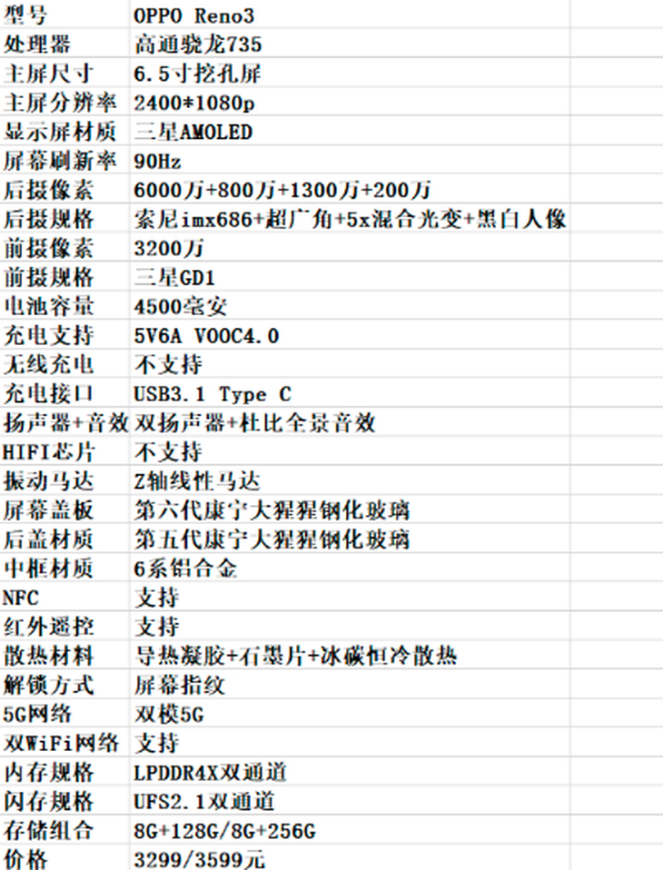 其他方面,OPPO Reno 3内置4500mAh电池,支持VOOC 4.0,将支持30W快充,由于采用大猩猩玻璃后盖设计所以不支持无线充电。令人好奇的是,全新Reno 3会不会继续沿袭经典的侧旋升降式结构方案呢?