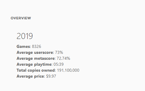 首先,SteamSpy的统计数字由于地区和DLC差异会出现细微误差,但不影响宏观判断。网站更新后给出的全年发布游戏数量为8326款,平均用户评分为73%,平均定价为9.97美金(70左右RMB)。