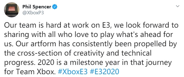 Phil Spencer 在 Twitter 中表示,Xbox 的团队在为 E3 努力工作,他们非常期待能与所有喜爱 Xbox 游戏的玩家们一同分享,Xbox 的艺术形式一直在被创新和技术的进步所推动。最后 Phil Spencer 也说到:“2020对于 Xbox 团队的旅程来说,将是具有里程碑意义的一年。”