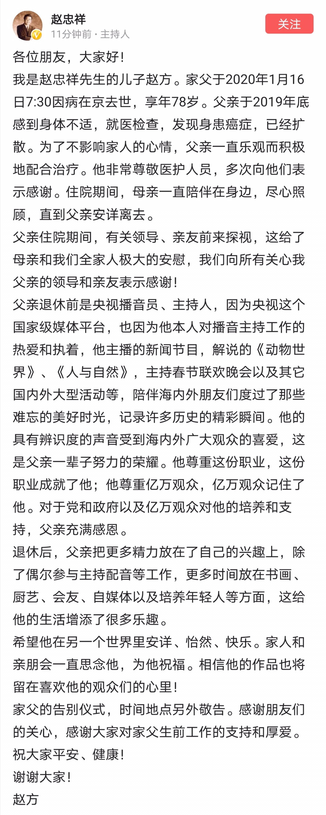 我是赵忠祥先生的儿子赵方。家父于2020年1月16日7:30因病在京去世,享年78岁。父亲于2019年底感到身体不适,就医检查,发现身患癌症,已经扩散。为了不影响家人的心情,父亲一直乐观而积极地配合治疗。他非常尊敬医护人员,多次向他们表示感谢。住院期间,母亲一直陪伴在身边,尽心照顾,直到父亲安详离去。