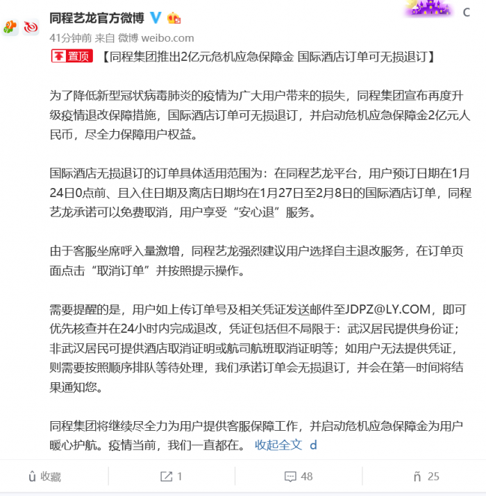 1月27日下午消息,同程集团今日宣布升级疫情退改保障措施,国际酒店订单可无损退订,并启动危机应急保障金2亿元人民币,尽全力保障用户权益。国际酒店无损退订的订单具体适用范围为:在同程艺龙平台,用户预订日期在1月24日0点前、且入住日期及离店日期均在1月27日至2月8日的国际酒店订单,同程艺龙承诺可以免费取消。