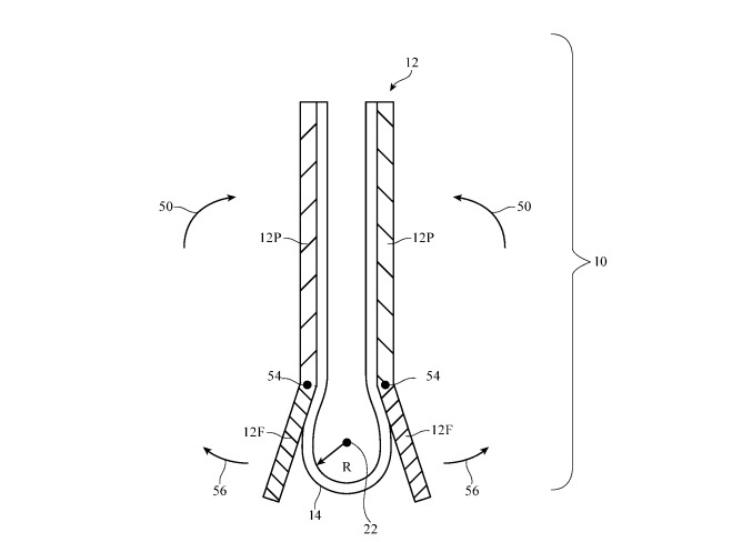 苹果公司的解决方案是,它需要以某种方式弯曲显示屏,特别是使中间部分在弯曲之前稍微向外弯曲。这样,可以使远离弯曲区域的显示屏主要部分和边缘尽可能接近地会合,同时允许弯曲部分以较大的半径弯曲,从而使应力最小化。为此,苹果提出了一种铰链机制,该机制可使屏幕由主壳体支撑,并保持平坦,在弯曲时,铰链机构同时使外壳的元件围绕弯曲处所在的部分旋转,让设备看起来整洁。