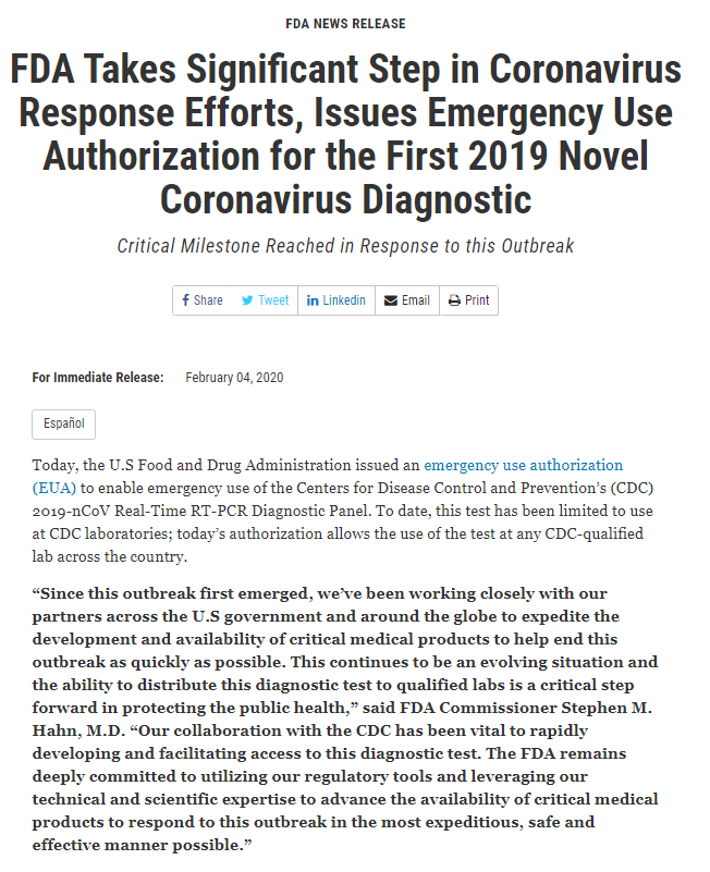 FDA表示:“目前,联邦卫生官员继续认为,这种病毒对美国普通民众的威胁相对较低。”尽管如此,美国政府面临着加速可能情况诊断的压力,这主要是因为冠状病毒潜伏期相对较长。美国卫生与公共服务部(HHS)于2020年1月31日宣布其为公共卫生突发事件。