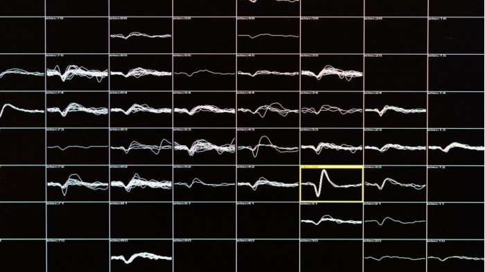 戈麦斯大脑的电信号,每个格子代表一个电极,格子中弯弯曲曲的线条,显示的是来自神经元的信号