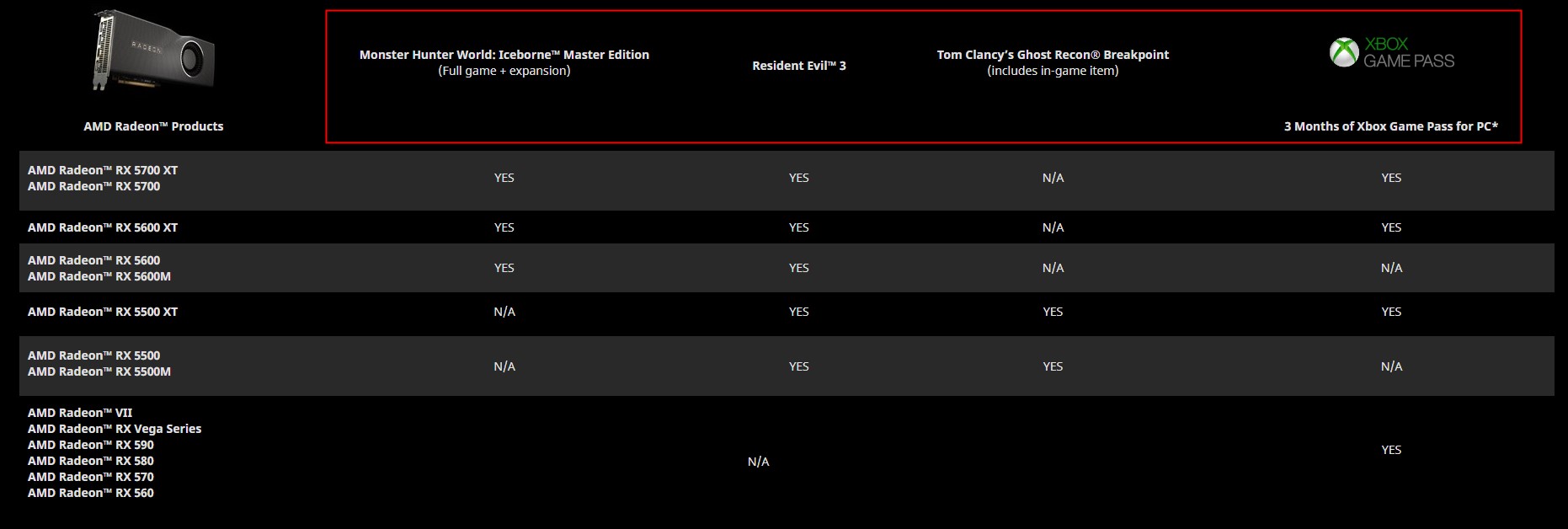 当时活动诡异地缺失了RX 5600/5600M两款显卡,没想到AMD随后追加了,但却出现一个新变化,即将《魔兽争霸3:重制版》移除。现在仅剩《幽灵行动:断点》、《生化危机3:重制版》、《怪物猎人世界:冰原》(本体+DLC)和3个月的PC版XGP。