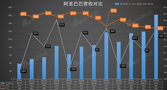 疫情期间,阿里巴巴交出了一份看似“亮眼”的财报。截至2019年12月31日止季度业绩,阿里的营收达到1614.56亿元,增长为38%。净利润为501.32亿元,与上年同期的309.64亿元相比增长62%。
