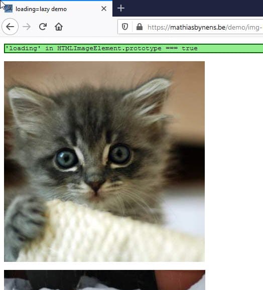 4. 现在,重新启动浏览器,访问 IMG loading lazy demo site ,并尝试向下滚动,可以发现猫的图片会一次又一次地加载。 您还可以在顶部看到“HTMLImageElement.prototype”的“loading”值为true,在非 Nightly 版本中,其则显示为 false。