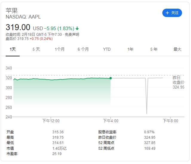 在美国股市周二开盘前,苹果股价下跌逾4%,不过开盘后收复了部分失地,最终收盘时下跌1.83%。苹果目前股价与去年6月阶段性低点相比上涨逾80%,与上周创下的历史最高点相比,跌幅仍不到4%。