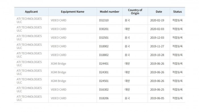 pcgamesn发现AMD在2月3日和2月19日在韩国分别注册了D30201和D32310两张显卡,此前2019年12月3日注册的D32501其实就是RX 5600 XT,这卡今年1月21日发布,看来AMD注册的两张新卡将会在下个月发布,可能会是大家所期待的RDNA 2架构显卡,实际上Navi 2X系列核心已经出现在Linux驱动代码里面,估计AMD也应该准备得差不多了。