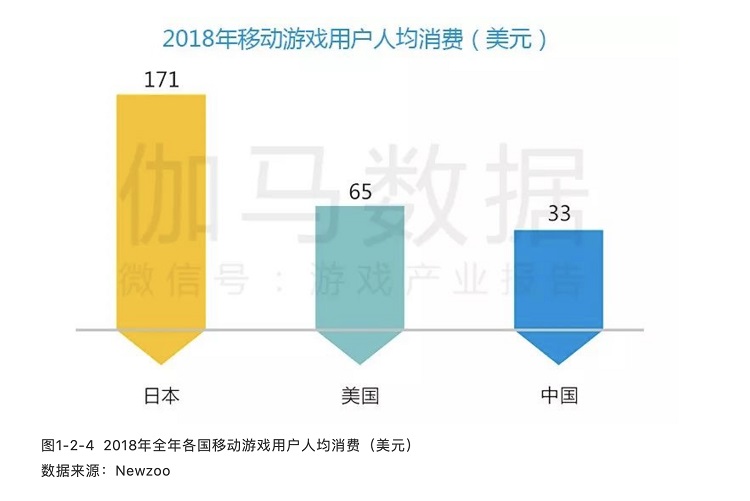 而按照伽马数据和Newzoo共同发布的《2019日本移动游戏市场调查报告》,2018年日本手游用户人均付费为171美元,是第二名美国的2.6倍、第三名中国的5.2倍。