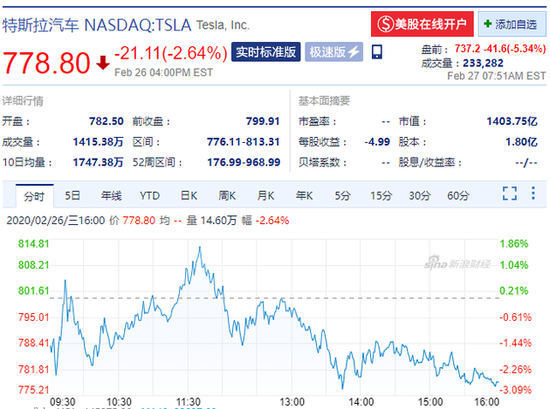 特斯拉盘前跌超5%,报737.2美元。此前据外媒报道,特斯拉1月份在华新车注册量较上月大幅减少46%,原因是农历春节假期和新冠病毒疫情延缓了购车者的脚步。