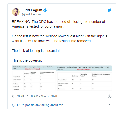 据外媒The Verge报道,当地时间周一,美国疾病控制与预防中心(CDC)从其网站上删除了接受新型冠状病毒检测的人数统计。这一变化最早是由记者贾德·莱格姆(Judd Legum)在Twitter上报道的。不到一周前美国出现首例感染途径不明的新冠确诊病例。在过去的几天中,在华盛顿州已确认有6人死于因病毒引起的疾病COVID-19。