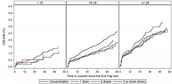 分析结果显示,在细胞学检查出现HSIL或ASC-H的比例上,接种3针疫苗对15-19岁的女性,确实保护效果会更好一点,但优势相当有限,只是风险比(HR)0.87和0.84的差距。放到其他年龄段,连这点优势都没有。