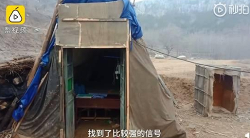 为了上网课,家人在山坡上为他搭一个棚子,用来遮风挡雨,冷了就跳绳、做做运动。