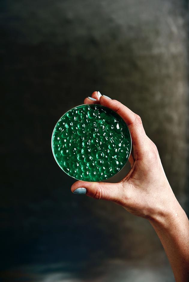 效仿前辈厨师,科布伦茨也从利用当地环境着手。众所周知,液体在微重力下形态特殊,不向往常的水流或水滴状,而是摇摇晃晃的水团。这让她联想到了分子美食,尤其是使用氯化钙和海藻酸钠将液体变成粘稠的鱼子酱形状的颗粒的技术。这种颗粒入口即化,在舌尖上释放出美味。科布伦茨需要在零重力环境下测试一种特殊的球化工作台——大概就是一个带有预装注射器的有机玻璃手套箱。她会把一滴生姜提取物注入柠檬味的泡泡球,或者把红橙注入甜菜汁泡泡球,在泡泡里包裹又一个泡泡可以带来在地球上难以享受到的独特多重“爆浆”体验。而且跟地球上的装在盘子里的泡泡球不同,科布伦茨的泡泡球是漂浮在空中的,所以相比180度角度,你可以360度全方位地欣赏这些美食,设计不同的食物造型。整个过程,看起来像是异想天开,但或许真的可以为未来的太空旅行者提供一个愉快的机会,来展示他们的烹饪创意,同时享受美食——哪怕“太空脸”会抑制你的食欲。