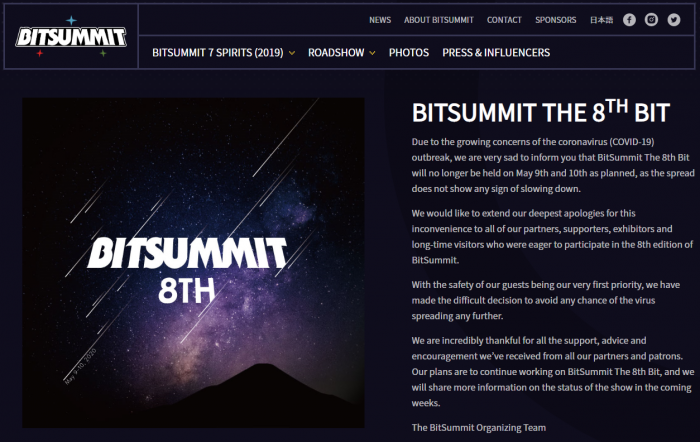受疫情影响,原定于今年5月举办的日本独立游戏展 BitSummit 宣布取消,其官网也发布了正式公告,对相关参与者表示了歉意。“对于新冠病毒疫情爆发的担忧日渐加深,我们非常遗憾的通知大家第八届 BitSummit(BitSummit The 8th Bit)将无法如期在5月9日和10日举办,因为病毒的传播并没有任何减缓的迹象。