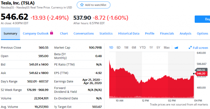 星期五常规交易中,特斯拉股价下跌13.93美元,跌幅为2.49%,报收于546.62美元。盘中特斯拉股价一度探底502.01美元,跌幅一度达到10.4%。特斯拉股价下跌幅度远高于大盘,与今年早些时候的高点相比,特斯拉股价下跌了45%。自去年末、今年初狂涨后,投资者开始重估特斯拉价值,星期五的下跌,可能是更大范围调整的一部分。虽然最近特斯拉股价大跌,但与上年同期相比仍然上涨了115%,这就彰显了星期五的下跌是更大范围调整一部分的原因。当然,特斯拉股价最近的下跌与大盘一致。由于对疫情传播的担忧引发恐慌性抛盘,结束了有史以来最长的牛市,自2月19日以来标普500指数下降了25%。尽管特斯拉股价下跌,星期五标普500指数还是上涨了9.29%。部分分析师和投资者可能担心由疫情带来的挑战,会使得2020年特斯拉汽车销量低于预期。