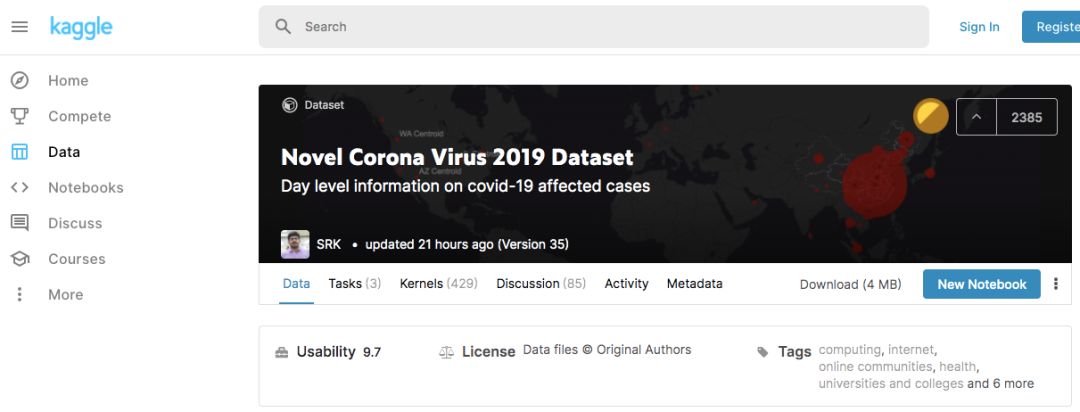 谷歌的数据科学竞赛平台Kaggle上已经有一个COVID-19病例数据集,并且每天都会更新。这些数据是可靠的,包括患者年龄、位置、开始出现症状的时间、暴露的时间、进入医院的时间等等。超过400人在自己的分析中使用了这些数据。
