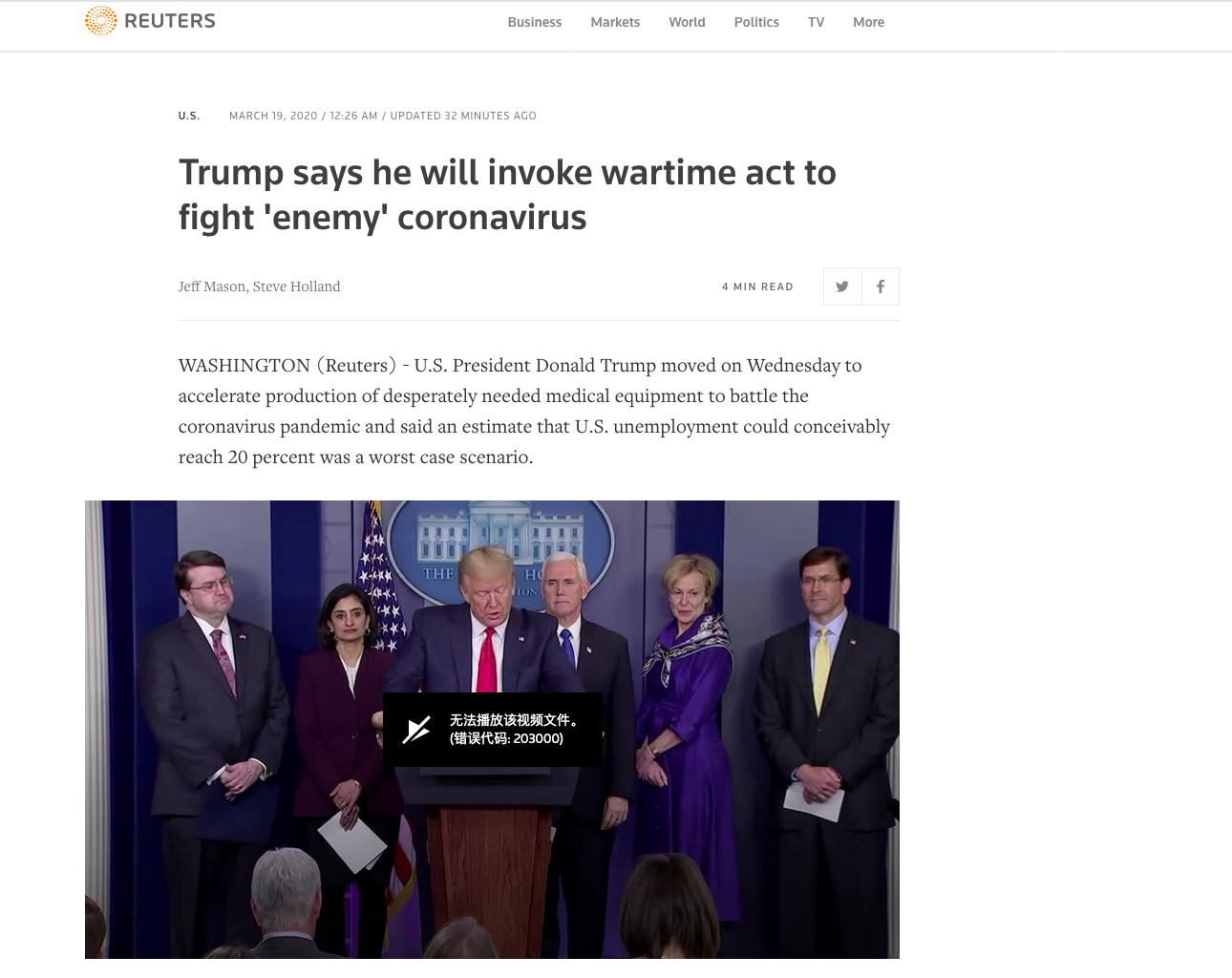 《特朗普宣布将启动战时法案扩大防护设备生产》