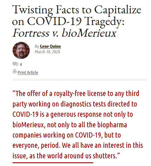 IP Watchdog,《 Twisting Facts to Capitalize on COVID-19 Tragedy: Fortress v. bioMerieux 》