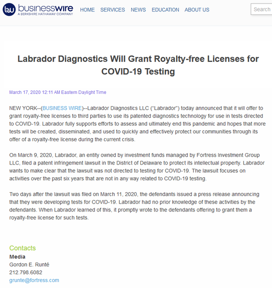 Business Wire,《 Labrador Diagnostics Will Grant Royalty-free Licenses for COVID-19 Testing 》